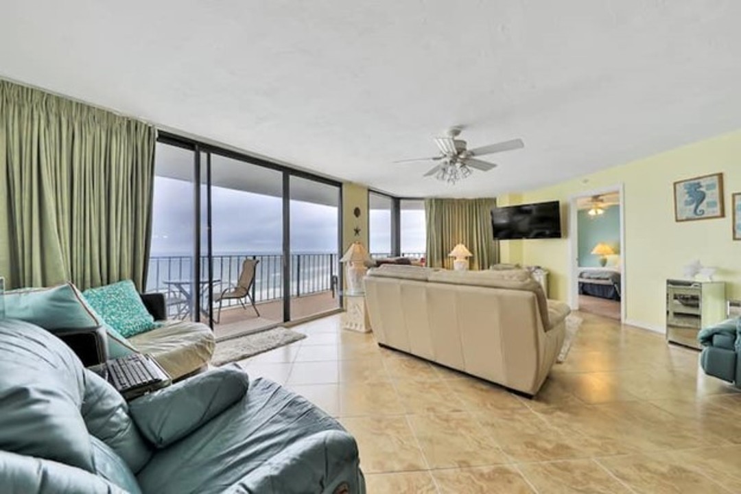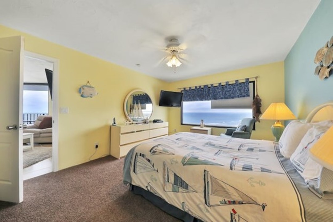 Escape to this Daytona Beach Shores condo, situated on the 14th floor of a 20-story beachside building with a grand atrium with fountains, a poolside sunroom with an eating area, self-serve library, a heated community spa, and dry saunas. Take in the panoramic views of the ocean and enjoy the spaciousness of this updated, immaculate condo only steps from the beach. You'll also have access to a shared pool and hot tub. You will find this modern three-bedroom vacation beach condominium to be spacious for your family to spend your two-week vacation or longer. This is truly a home away from home with large walk-in closets, open kitchen allowing for an amazing view of your family while cooking or the Atlantic Ocean through the large glass doors leading to the balcony. ,